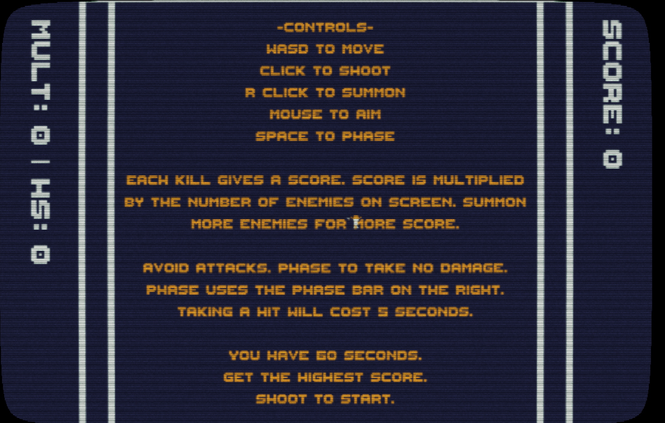 Avoid attacks. Phase to take no damage. Phase uses the phase bar on the right. Taking a hit will cost 5 seconds.